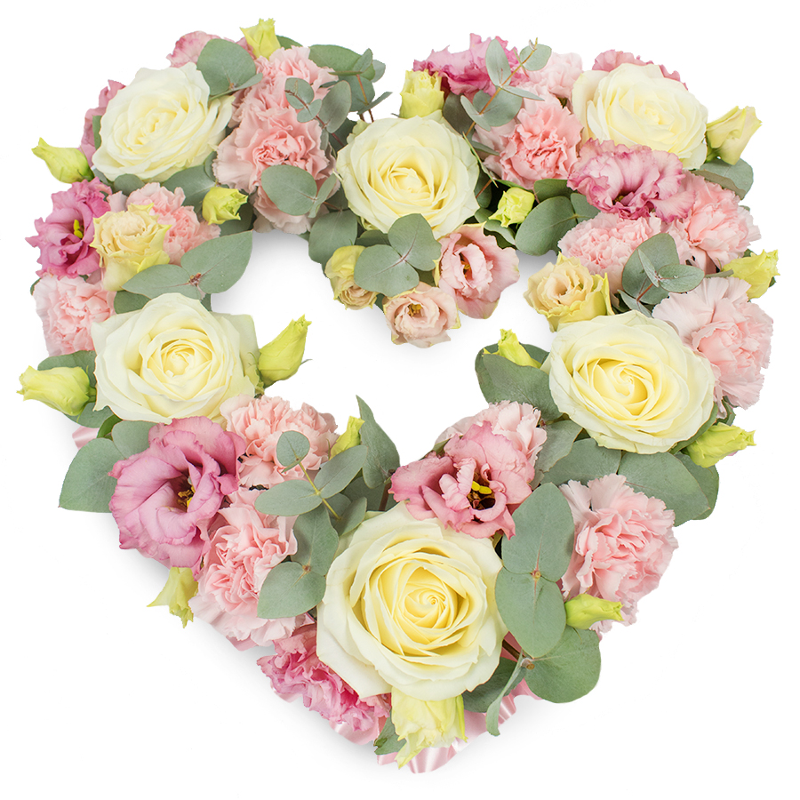 Express your sincere emotions with our Delicate Open Heart Tribute Bouquet, a thoughtfully arranged floral tribute designed to honor and remember your loved one. This stunning bouquet features a harmonious blend of white roses, pink carnations, pink lisianthus, and eucalyptus leaves, all meticulously hand-selected for their exceptional freshness and beauty.